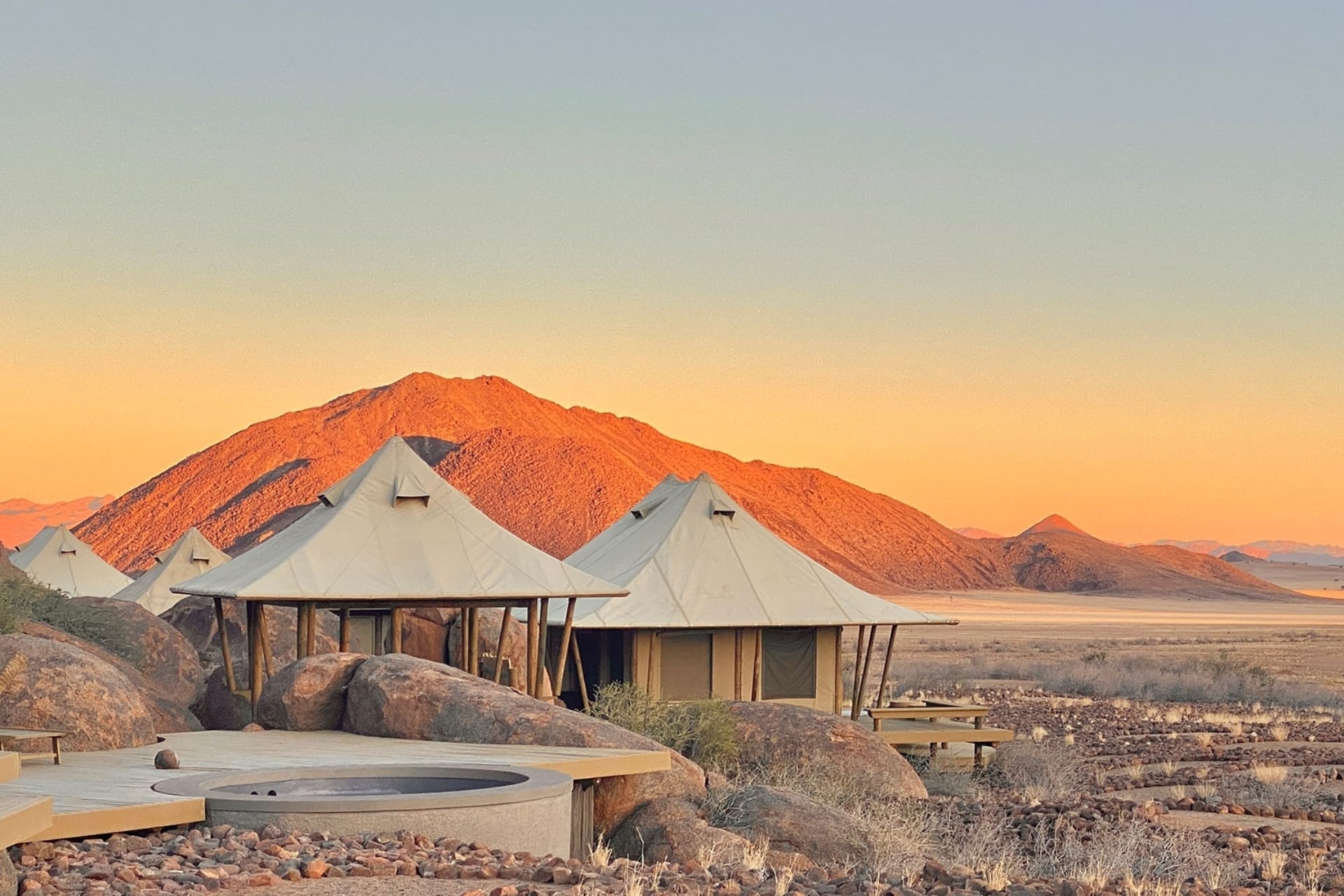 The camp, known for its intimate setting, accommodates a maximum of 10 guests in five spacious tented rooms. These tents are thoughtfully designed to bring the outside in, with large rooms that open up on three sides, allowing guests to experience the beauty of the desert landscape up close. The suites feature spacious decks, and some have private plunge pools, adding a luxurious touch to the experience. The main guest area includes a dining and lounge tent, a breakfast deck, a library, a pool, and an open fireplace, all of which contribute to a comfortable and communal atmosphere.